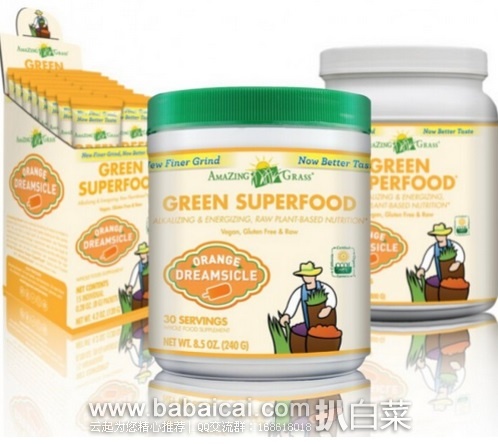 Amazing Grass Green Superfood Orange Dreamsicle超级绿色食品,原料全部来源于有机绿色食物,获得加州有机农场认证(CCOF),不含转基因物质,天然无麸质,适合作为膳食补充,每份可实现5至9份水果和蔬菜摄取量,促进身体碱性平衡和健康免疫功能。