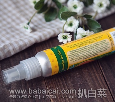 利用迷迭香、香茅和冬青基础油的怡人香气天然驱除昆虫。不含DEET(驱蚊胺)、石油制品及合成化学品。驱蚊效果很好,它比小蜜蜂防蚊液质地清爽很多,因为添加了柠檬成分,味道也要好闻很多。防蚊效果是一样的可持续四个小时,而且都不含驱蚊胺,可放心给宝宝用的。市面上那些驱蚊效果说持续6小时以上的都是100%添加避蚊胺的,长期使用,对宝宝的皮肤及大脑神经伤害都特别大。