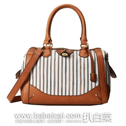 这款London Fog Lark Satchel手提斜挎包采用合成皮革材质,海军条纹,卡其色包边,很有特色!包包尺寸33*25*17.5cm,搭配可调节肩带,可手提可斜挎。包面带有其经典的挂锁设计,精致的金属品牌LOGO镶嵌其上。内设有两个小袋,一个卡袋和一个拉链袋,包包容量也挺大的,适合日常出行背戴。