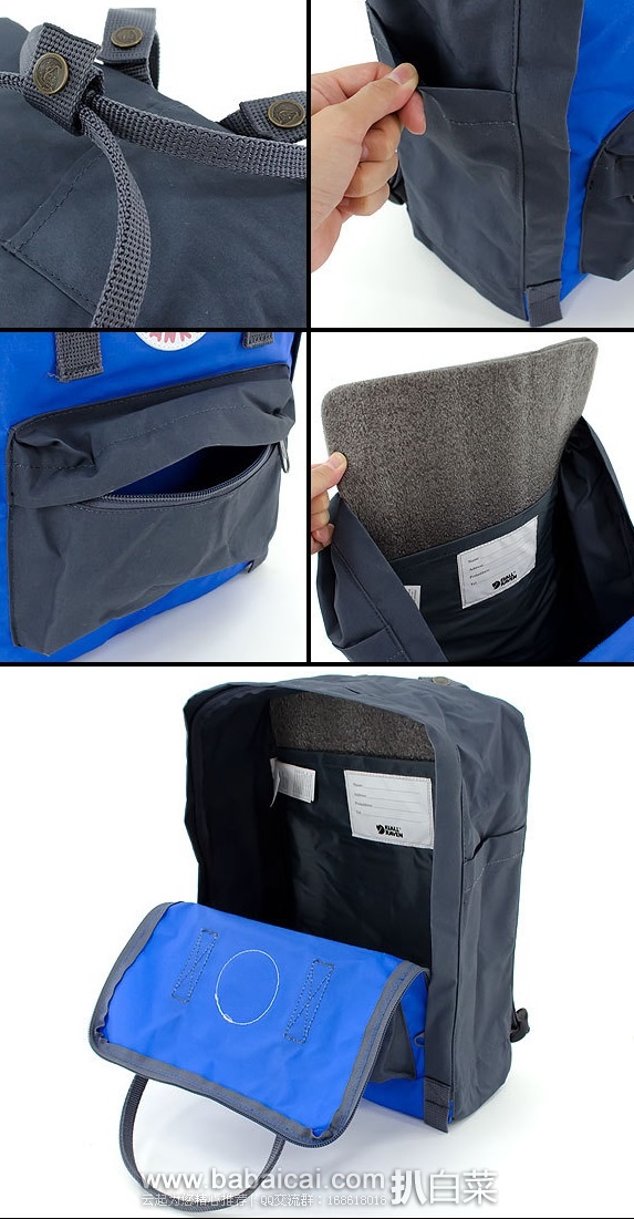 北 极狐 经典背包,早在1978年推出第一代,最初是为瑞典学校中的孩子们设计开发的,现已成为很多瑞典人从小到大伴随一生的背包。背提包做工严谨精良,三围约 13*38*27厘米,主仓容量约16L,重量约300克,十分轻便。四方的外型,符合瑞典风格。包身面料为Vinylon F,可轻度防水,快干,轻便耐磨,经多次洗涤也不会降低其防水性能。主仓隐藏式拉链开合,正面有北极狐的反光logo和1个拉链外袋,侧面各有1个口袋可 以放水壶等用品。