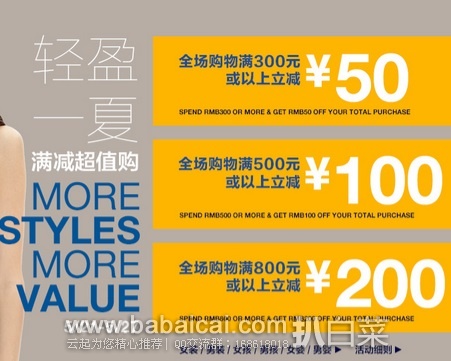 GAP中国官网目前有全场购物促销满减优惠,买满¥300,立减¥50;满¥500,立减¥100;满¥800,立减¥200,无需优惠码,结算时自动享受满减优惠。夏日新品本身就有限时7折优惠,叠加满减后自然是更加实惠了。Gap中国官网活动地址>>