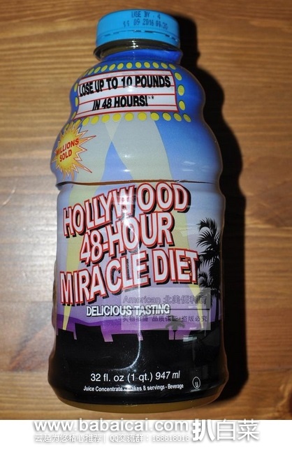 这款Hollywood Diet Hollywood 48-Hour Miracle Diet减肥排毒果汁的原理是,通过膳食纤维,让你有饱腹感,禁食两天,自身消耗掉身体的脂肪。大致相当于这几年经常提到的“轻断食”。974毫升,淡淡的黄色浓缩果汁,味道挺不错的,绝对很容易喝下去。成分很天然:菠萝、苹果、橙子浓缩汁,杏、桃、香蕉果泥,棕榈酸维生素A、维生素C、维生素D、维生素、抗坏血酸、硝酸硫胺(维生素B)、核黄素(维生素B2、盐酸吡哆醇(维生素B6)、氰钴胺(维生素B12)、烟酸、叶酸、泛酸和一种特殊的混合精油、佛手柑、柑橘、柠檬。