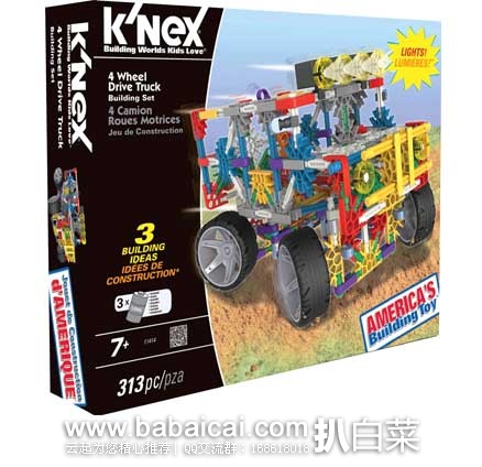 K'NEX Classics 4 Wheel Drive Truck科乐思经典4轮卡车,313颗粒,美国产,4个大轮子在艰难的地形上全速前进吧,还可变化成沙滩车,共三种模型 (结合同系列产品还能拼插出更牛X的模型),内附3节电池,4个大灯霸气侧漏。可玩性高,适合7+孩子,或是家长陪同一起亲子游戏也不错。