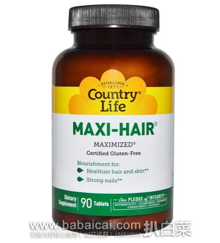 Country Life 乡村生活是一个绝对有诚意的高端品牌,他的特别就在于精致的棕色玻璃瓶,为了达到遮光效果,更好的保存产品。这款Country Life, Gluten Free, Maxi-Hair, Time Release, 90 Tablets产品主要是B族(含生物素)和螯合矿物质、MSM、半胱氨酸、蛋氨酸等。虽然成分很常见,吃了就是有效果,有网友评价说:“吃了两个月,前额脱发的地方就长出绒毛了,期间换过其他品牌的类似产品,就是感觉没它有效果,最好还是换回来。”