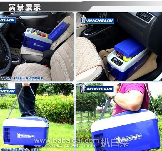 MICHELIN 米其林 5274ML 车载冰箱8L,是一款可车家两用的车载冷暖箱,采用半导体制冷和制热技术,纯铝内胆,双制冷模块,冷热可调,温度低至-5度,热度65度,容量8L,可容纳9听可乐,2m长12V独立雪茄头配线,便携式背带设计,使用方便;炎热的夏季,开车出行随时可以吃到冰爽的饮料了。