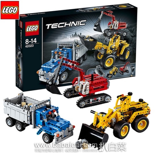 LEGO 乐高 42023 科技机械组系列 建筑车辆套装 共含834颗粒,套装包括装载机、自动倾斜卡车和挖掘机,每台机械车辆都拥有逼真的功能。良好的可动性。简单,小巧,却几乎能完成大型set所能做到的所有动作。特别是挖掘机,一个连杆系统就将挖斗的两个动作完美的同步完成,研究其中的机械原理简直是一种享受。42023套装包含三种颜色共计十五块圆柱颗粒3941,对纯科技玩家尤为难得。