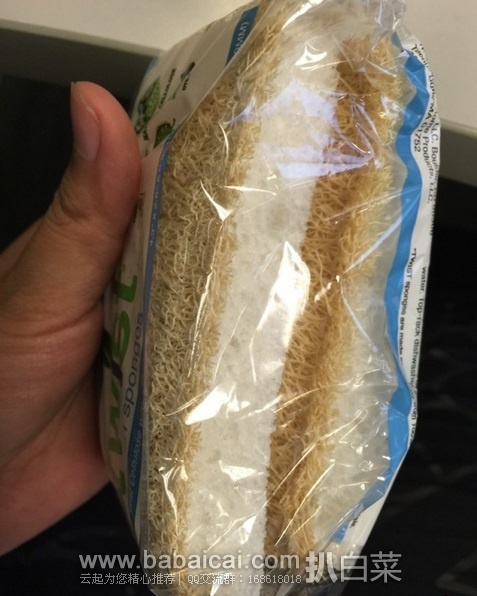这款Twist, Naked Sponge海绵,100%纯天然成分,可生物降解,没有染料,对人体完全无害。在美国时候都用这种海绵刷碗,国内也有海绵+百洁布的组合刷碗用,但是都是普通海绵,用一段时间海绵就烂了,会一块一块掉渣,百洁布也会随之变形,而这种海绵我用了很长时间,反正不会烂。国内现在一般用这种海绵洗澡用,尤其是给婴幼儿洗澡,其实似乎很不合适,因为这种海绵表面粗糙,摩擦力强,适合做搓洗清洁,完全不适合给人类搓皮肤用。