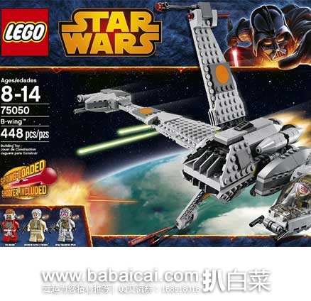 LEGO Star Wars 75050 B-Wing Building Toy乐高星球大战B翼战斗机,货号为75050,2014年夏天上市,5袋零件共包含448个颗粒,3个玩偶公仔,可开合驾驶舱,副翼可折叠,变化形态,在太空中急速前进吧。星战乐高迷的必败品!