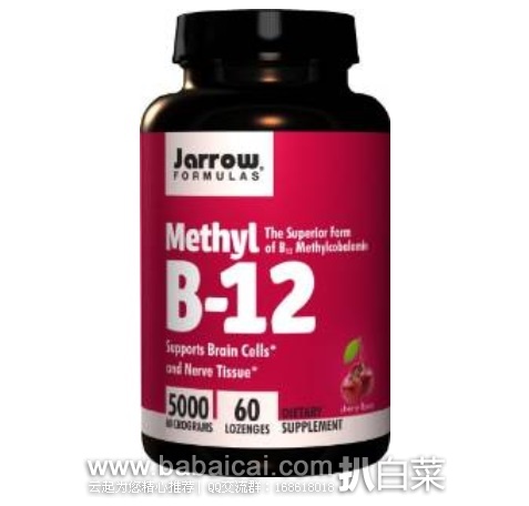 这款Jarrow Formulas Methylcobalamin (Methyl B12), 5000mcg, 60 Lozenges杰诺维生素B12片,是美亚销量第一的B12补充剂,比其他的B12(例如,氰钴胺)更容易被身体吸收和保留,每片B12含量高达5000mcg,可促进红细胞的发育和成熟,使肌体造血机能处于正常状态,预防恶性贫血,维护神经系统健康,增加叶酸的利用率,促进碳水化合物、脂肪和蛋白质的代谢,保持最佳能量水平,提升活力。每日一片就能满足全天需求,帮助维持神经系统健康和心血管健康、促进红血球生成以及帮助将食物转化成能量。