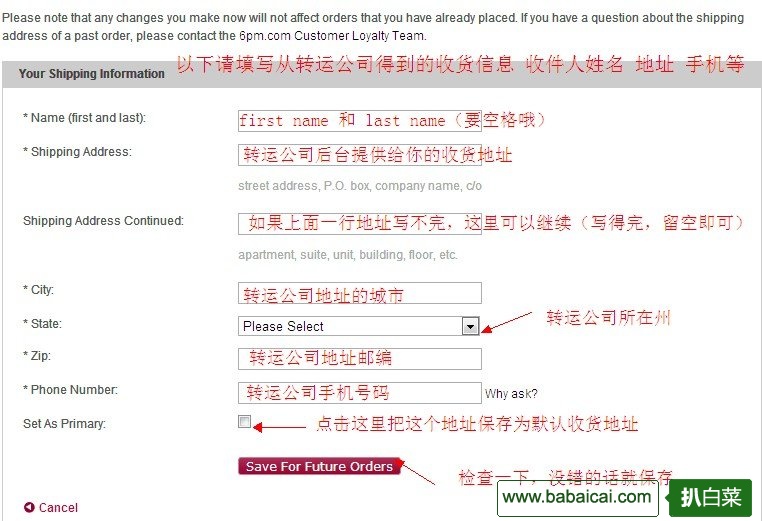 6pm下单邮寄地址(shipping address)填写参考下图