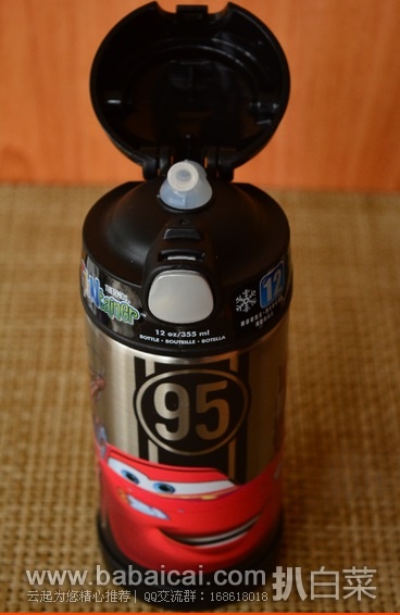 Thermos 12 Ounce Funtainer Bottle膳 魔师儿童保温吸管杯,容量为355ml,相比之前F4001的老款,最大区别就在于上盖增加了一个可折叠的拎手,不用担心手滑摔坏杯子了,采用双层真空抗 摔不锈钢瓶身,可保冷12小时(7度以下),保热6小时(42度以上)。食品级PP塑胶杯盖不含双酚A(BPA),大开口设计便于清洗,抗摔设计,采用安 全开关,一按即可弹出吸管,并且完全防漏,适合儿童使用,婴儿平时出门带点热水冲奶粉也很好用。