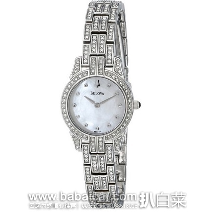 Bulova Women's 96L149 Crystal Round Watch 宝路华女士腕表,白色珍珠母贝圆形表盘,表盘宽度23mm,厚度仅有7mm,表盘、表带和表圈上镶嵌大量水晶,bulingbuling闪耀夺目,日本石英机芯,矿物防刮表镜,30米生活防水