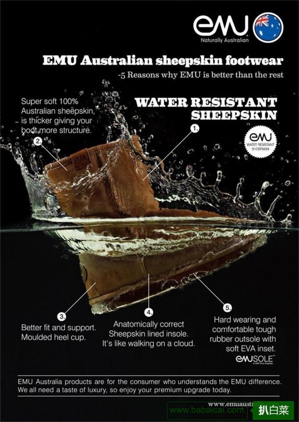 与美国注册的UGG不同,EMU Australia是来自澳洲的土生土长的本土品牌,1978年创立,在目前雪地靴品牌中,与UGG同处于第一阵营,原料采用澳洲和新西兰皮毛一体羊毛,再加上传统手工艺制作,EMU雪地靴款式与UGG Australia大同小异,但价格却比UGG雪地靴便宜一些。