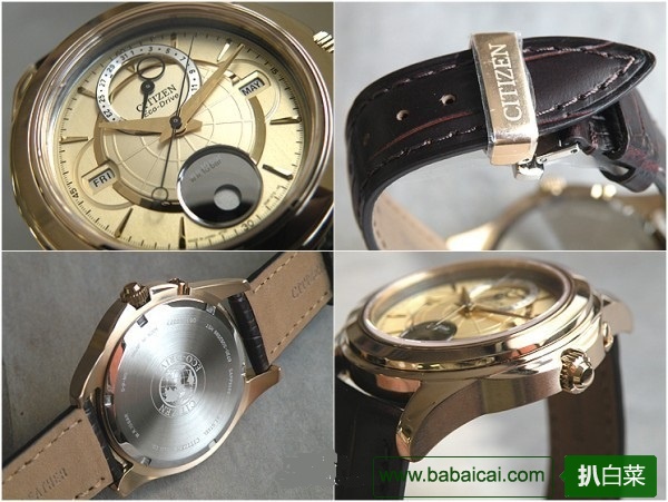 这款型号为BU0003-02P西铁城光动能月相男士腕表,使用的是Calibre 8730光动能机芯,无需更换电池,玫瑰金表盘,表盘直径42mm,厚度11mm,12点钟处的小表盘为日历,3点钟处显示月份,9点钟处显示星期,6点 钟处为月相显示,表盘中心圆为浮雕地球纹,三指针时间指示,不锈钢镀玫瑰金的表圈和表壳,搭配小牛皮表带,再加上双按式蝴蝶扣,精致的商务派,采用蓝宝石 玻璃表镜,防水深度为200米。
