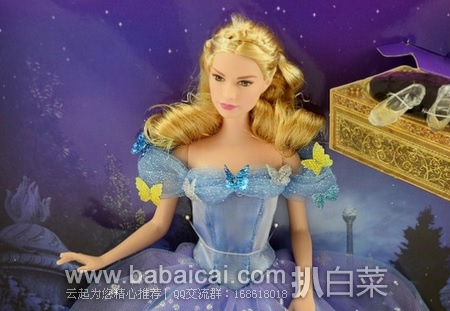 Disney Cinderella Royal Ball Cinderella Doll迪斯尼皇家舞会灰姑娘,身着浅蓝色的及地裙,低胸点缀蝴蝶设计,浅蓝紫色蕾丝裙摆,以及闪耀的水晶鞋,显得素雅又不失华贵。盒装尺寸约27*8.6*32.5cm,适合3-13岁小公主,当然也少不了喜爱收藏芭比娃娃的大孩子们。