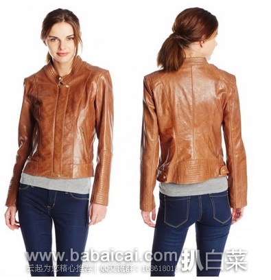 Cole Haan Women's Leather Jacket可汗女士真皮夹克,采用100%真皮面料,全拉链设计,领口小扣防风,绗缝袖口、肩部和立领,修身版型,两侧设计有拉链口袋,插手置物均可。
