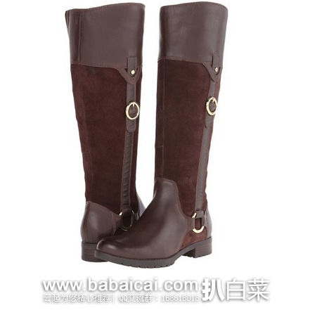 以舒适著称的ROCKPORT乐步是全球首家获得APMA美国足病医学协会推荐的品牌,其产品具备正装鞋的外观,运动鞋的脚感,在国内外口碑都不错。这款Rockport Women's Tristina Buckle Riding Boot乐步女款高筒靴,以马靴造型设计,金属扣的点缀,干练利落的外形,搭配牛仔裤就是经典。采用光面真皮拼接翻毛皮的设计,看起来轻松活泼不老气,EVA中底,外加ADIPRENE减震中底,可以缓解脚部长时间穿着的疲劳,舒适耐穿,橡胶大底,防滑耐磨。