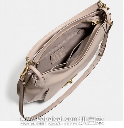 COACH Smooth Calf Leather Circle Hobo寇驰女士真皮单肩包,尺寸约37(L) x 35(H) x 11(W)cm ,包型容量也不小,包身采用细腻柔软的光滑小牛皮材质,正面设计有一个搭扣小口袋,包顶拉链封口,内袋还设计了两个插袋和一个内侧拉链口袋。18K镀金的金属配件,精致且耐用,是一款出街通勤均适合的包包。