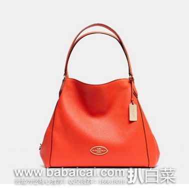 COACH Refined Pebbled Leather Edie Shoulder Bag 蔻驰女士真皮单肩手提包,采用柔软的真皮材质,包身正面仅品牌LOGO点缀,顶端拉链开口,内部设计有一个拉链口袋和两个插袋,尺寸约35.5*30.5*15cm,两边双按扣口袋分层方便,空间也足够大,简约大方的款式随意百搭,美腻的橙红让人心情也暖暖哒。