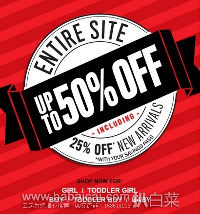 The Children's Place美国童装官网目前推出以下活动:全场童装五折,可叠加新品25%off,订单满$75可以使用额外7折优惠码SAVEMORE3,免美国境内运费。TCP活动地址>>