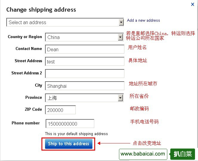 下图为点击后的修改地址页面,如果转运,按转运提供的仓库地址填写,若直邮,拼音填写国内实际收货地址即可。