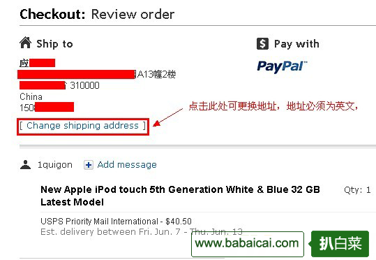 如果之前在ebay已经添了收货地址,会自动填充,不然的话是会提醒需要重填地址。顶部的提醒告诉你,如果出错会有错误提示,告诉你如何修改。支付信息右下方可填写优惠码或Giftcard。底部有提交按钮。提交后就可以进入PayPal支付页面付款就可以啦!