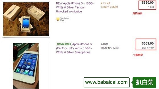 搜索结果出现后,如果价格下方显示“* bid”的说明该商品是竞价拍卖;如果价格下方显示的是“Buy it now”,说明该商品是一口价立即购买的。(直接关注扒白菜的ebay值得买推荐就可以不会错过任何海淘白菜)