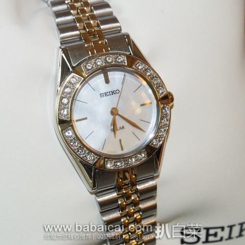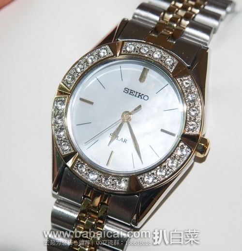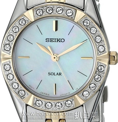 Seiko Women's SUP094 Solar Classic Dress Watch精工太阳能女士腕表,采用太阳能石英机芯,终身免维护,珍珠贝母表盘加上表圈上24粒水晶装饰,BOLINGBOLING很讨女孩子喜欢,不锈钢间金表带,表盘24mm,厚度只有7mm,轻薄小巧。强化Hardlex矿物耐磨表镜,防水30米。