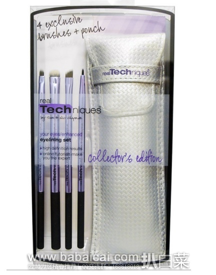 这款Real Techniques by Samantha Chapman, Your Eyes/Enhanced Eyelining Set, 4 Exclusive Brushes + Pouch面部化妆刷4件套,主要用于眼部,采用高档合成纤维毛柔软度不输动物毛,刷毛弹性好,易 清洗。在化妆刷的铝制把柄上烫印着品牌名和各个化妆刷的使用名称,以方便大家使用。刷毛极其舒软,质地类毛绒的合成纤维,符合Paris Presents坚持的环保理念。每一个化妆刷的刷头都是由手工精确剪切制作而成,以符合人体工学。而且刷毛弹性好,易清洗,敏感肌的妹子也不用担心过敏。所以不论是用于粉类、液体类,还是膏状的化妆品,都是非常的适合