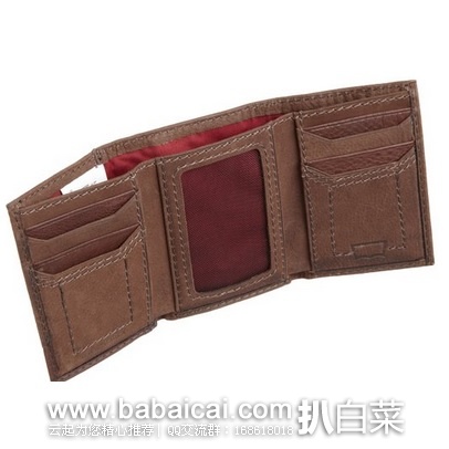 这款Levi's Mens Trifold Two-Tone Wallet李维斯男士三折钱包采用100%真皮制成,并对表面做了磨砂处理,竖版设计,妈妈再也不用担心毛爷爷放不下。正面采用双层设计并露出部分Levis马车图案,简约大方却不失其粗旷的牛仔风格。钱包内部带有一个大钞隔层、6个卡槽,并附赠一个透明翻盖式id窗,缝线进行了简单的加固和装饰处理。铁盒包装,送人自用都不错。