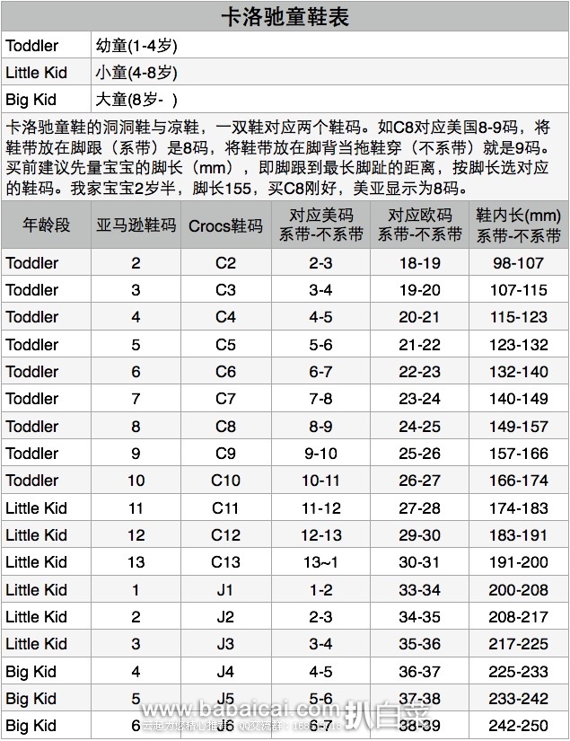 crocs设计比较宽松,天热的时候由于脚部的毛细血管膨胀,所以脚要比其它季节的要大一些。宽头的鞋能够让脚趾头很好的舒展开,即使脚很宽很胖也能很好的放置,这样的设计会使空气流通比较好,便于散热和排汗。crocs Kids' Classic Clog卡洛驰经典款童鞋,是卡洛驰推出的第一款鞋子,就是这款鞋子让卡洛驰出名的,也是卡洛驰销量最高的一款。这款鞋子的特点是有很多颜色可选