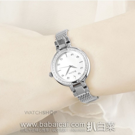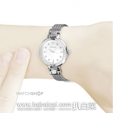 这款型号为96R177 的宝路华(Bulova)时尚女表,采用白色珍珠贝母表盘,表圈上镶有24颗闪耀夺目的天然真钻,天然真钻时标,表盘直径为29mm,厚度仅6.8mm,非常纤薄,日本石英机芯,比较少见的不锈钢表链,矿物水晶表镜,30米生活防水。