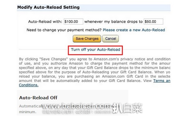 提示:该服务会在账户余额不足时自动从账户绑定的信用卡扣款补充余额。如果不需要不足额度自动补足的网友还请手动设置,如果你不需要,登录账号,到账户找到giftcard礼品卡管理页面,点击"Modify or turn off",在此页面点击Turn off your auto -reload,保存后取消成功,自动充值关闭。也可以修改自动充值金额。