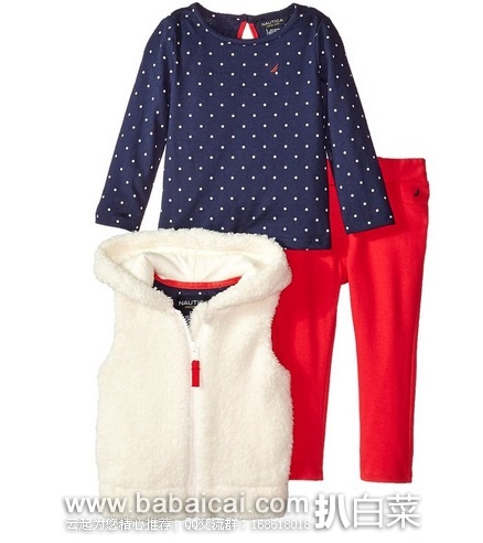 这款Nautica Baby Girls' 3 Piece Set with Teddy Fur Vest Dot Tee and Knit Pant女童套装,包括一件水玉点长袖T恤、一条打底裤和一件翻毛背心,100%纯棉材质,亲肤舒适,支持机洗,十分方便。