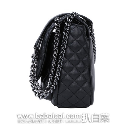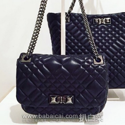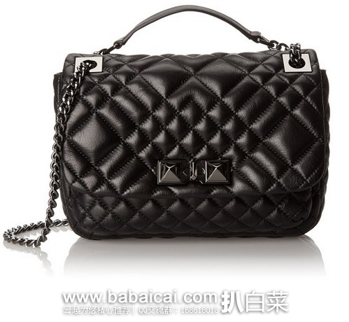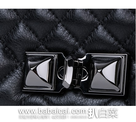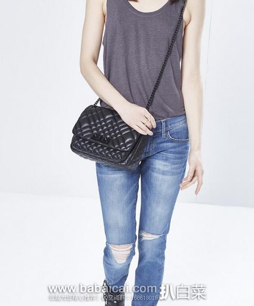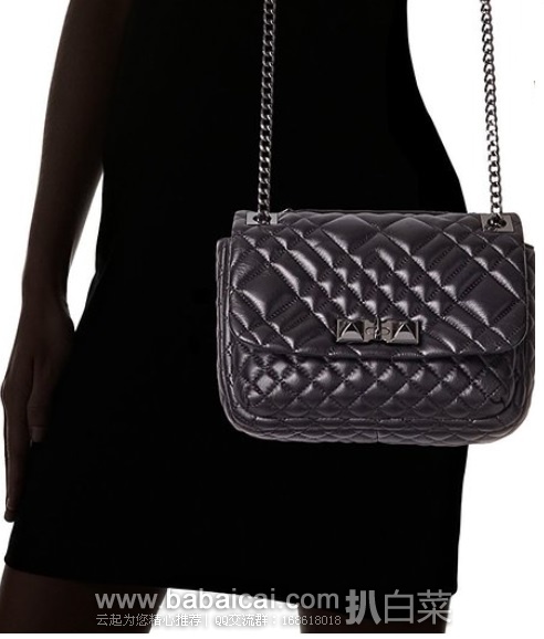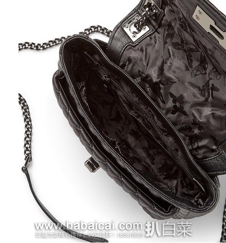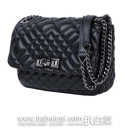这款Rebecca Minkoff Lenox Cross-Body Bag 女士牛皮单肩手提两用包,为2015年秋冬新款,浓浓的小香风,绗缝牛皮为这款美包带来奢华纹理元素,翻盖抛光锁扣定更为它增加了吸睛亮点。带衬里内部5个贴袋外部一个大袋。链式双提手。整体妩媚多姿,很显女性柔情似水的风韵。宽度25cm,高度17cm,厚7cm,肩带垂直高度30cm