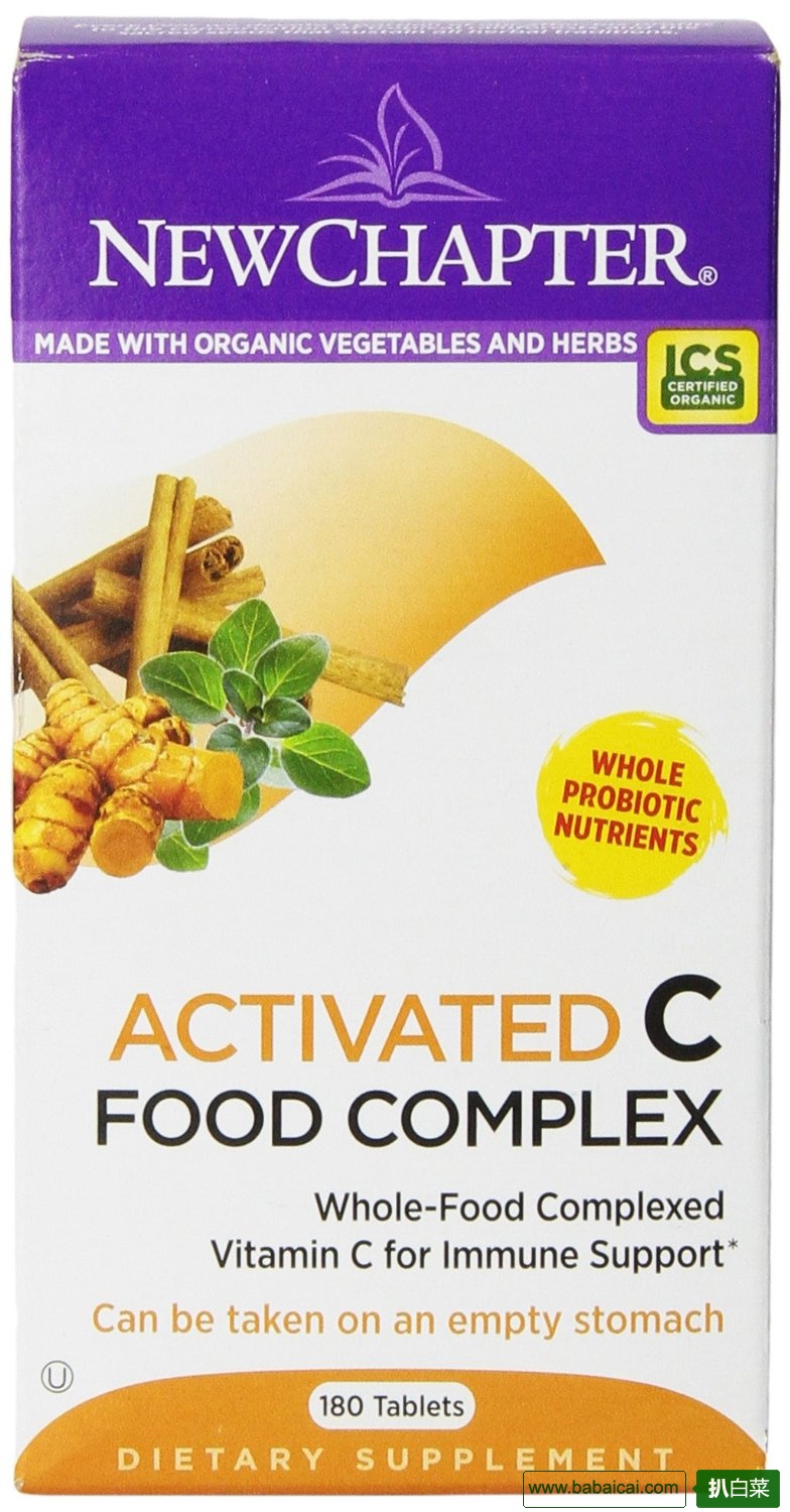 New Chapter无需多介绍了,最好的保健品牌之一,一分钱一分货,价格也一贯比其他品牌贵。New Chapter C Food Complex新章天然有机维生素C,全部提取自有机材料,通过美国农业部有机认证。添加有机草本接骨木和黄芪提取物,增强自身免疫力。另外添加有机肉 桂,迷迭香和牛至提取物,有效对抗氧化并促进正常细胞的生长。适合容易疲倦,工作于高污染环境,嗜好抽烟,从事剧烈运动和高强度劳动的人群,坏血病患者和 白内障患者。