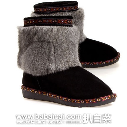 BEARPAW Women's Suni Boot熊掌女士兔毛雪地鞋,在熊掌所有雪地靴中算是比较美貌的一款,靴筒部位使用兔毛装饰,鞋边的沿条使用极具印第安风格的图腾,靴高7英寸,属于灵活轻便的短靴款式,内衬和鞋垫均为全羊皮材质,并且植入羊毛保暖。
