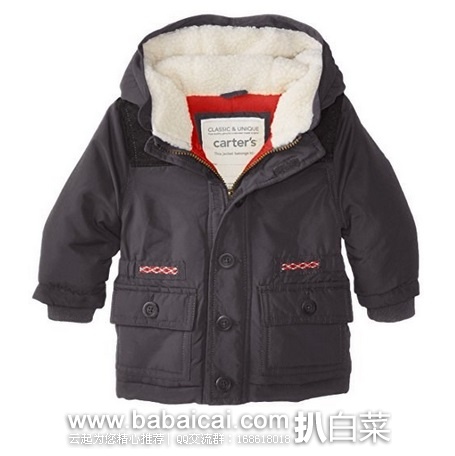 Carters作为美国著名的婴幼儿服装品牌,居美国0-24个月婴童系列市场的第一位,同时也是海淘一族中宝爸宝妈们为宝宝选购服饰的首选,其舒适柔软及设计风格清新相信已经不需多做介绍。卡特的服饰采用了最柔软的面料,颜色、剪裁与技术都独具清新风格,令人爱不释手。Carter’s产品的优点在于它的实用性、舒适和柔软。这款Carter's Baby Boys' Infants Heavyweight Single Jacket卡特男童连帽羊羔绒内胆保暖外套,连帽设计,帽子里是白色的羊羔绒,深灰色和蓝色都非常可爱。