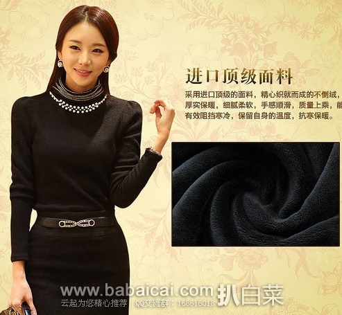 此款保暖打底衫,选用高端面料,花边领口,非常显优雅高贵,带有优良弹性,适合不同体型,不倒绒,加绒加厚,保暖一冬。