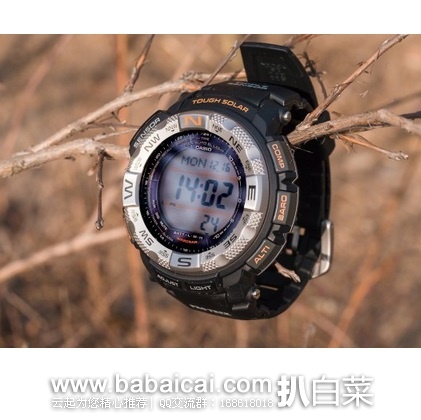 Casio Men's PRG260-1 Black Pro-Trek Watch卡西欧多功能手表,属于卡西欧PRO TREK系列,除带有CASIO当家三重感应器(数字高度计、气压计、温度计和指南针)外,还具备日出日落功能,太阳能供电无需电池,充满电最长可待机长达6个月。全自动EL背光,世界时间(48个城市),5组闹铃,1/100秒表功能等。表盘直径44mm(比一般CASIO户外表50mm以上的大块头袖珍很多,小手腕没压力了),厚度14mm,防刮矿物晶体表镜,树脂外壳和表带,防水深度100米。