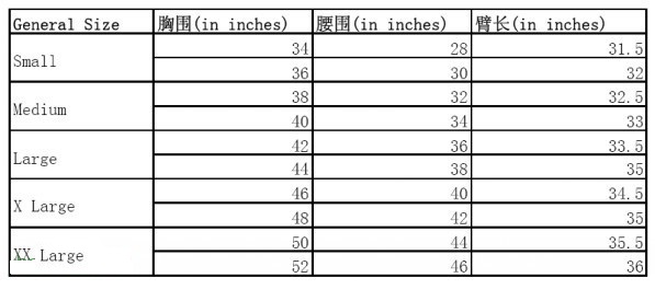 尺码建议:正常体型170=S,175=M,180=L,185=XL,偏肥偏胖者可以酌情加减,具体可参考下面尺码表,乘以2.54换算成cm尺码表如下,