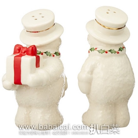 Lenox Lenox Happy Holly Days Snowman Salt and Pepper, Ivory莱诺克斯雪人椒盐罐是两个可爱的雪人形象,藏在身后的礼物,送给好朋友的礼物,让他猜猜是什么呢?精心制作的瓷器套组,用来放胡椒和盐,4英寸约10cm左右高,是你厨房里的一道温馨可爱的风景哦。