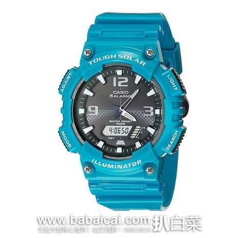 这款Casio Men's AQ-S810WC-3AVCF Tough Solar Analog-Digital Watch With Blue-Green Resin Band 卡西欧光动能运动腕表,采用树脂材质制成,天蓝色,双显设计,光动能石英机芯,通过太阳能直接转换电能,无需更换电池,支持时间、日期、星期显示,12/24小时自由切换,支持世界时间显示。表径约为47mm,100米防水等级。