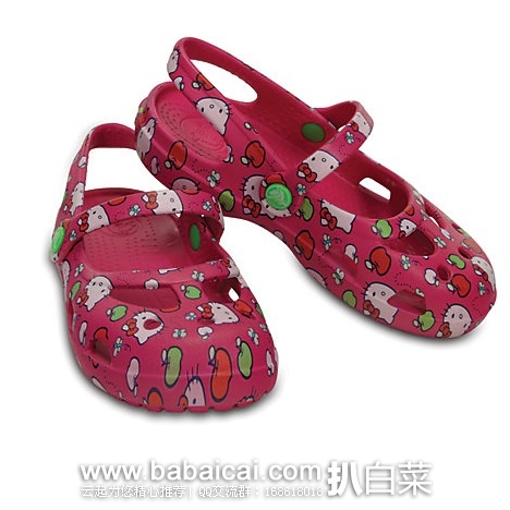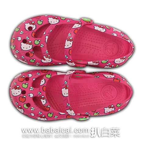 此款crocs Girls' Shayna Hello Kitty Apples Mary Jane卡骆驰女童玛丽珍洞洞鞋,使用的Crostile树脂是一种封闭式细胞树脂,能随着体温软化,顺贴足部线条,同时具有透气、排汗、防滑,更具有防滑及抗菌功能,使您从此远离鞋子发臭的情况,这绝非普通的塑胶或橡胶可以媲美!鞋床上铺有密密麻麻的凸点可时刻按摩脚部,防滑鞋底,在湿滑的地面行走也不怕。经典的kitty猫图案非常可爱,无论是大人还是小孩子自己都难以抗拒啊!