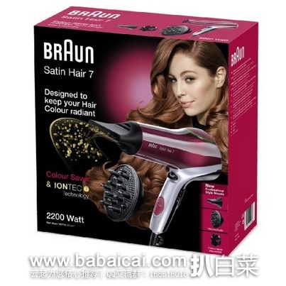 这款Braun Satin Hair 7 HD-770 德 国博朗 炫发护色离子吹风机HD770,是博朗吹风机的旗舰款式,集博朗所有护发技术为一身,专为保护染后发质而设计。功率2000瓦,有3个热量档和2个风力档 可选,采用Satin Protect丝滑保护系统,70℃恒温控制避免头发水分流失,绿色离子喷发口可释放数百万亮发负离子,从空气中抓捕水分渗透至毛鳞片和发芯,恢复头发的 水分平衡,独特炫彩护色技术+IONTEC炫发科技,可避免秀发和头皮受过高热量伤害,有效减少褪色症状。