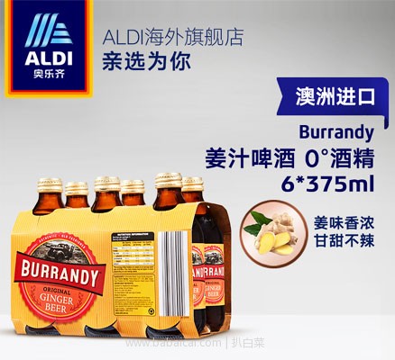 霍比特小镇绿龙酒吧的独特饮品,相信去过澳洲、新西兰的人士一定认识。这款Burrandy姜汁无酒精啤酒,每瓶容量375ml,选用澳洲本地生姜和甘蔗,特殊干燥工艺,姜味香浓不辛辣,甘蔗甜而不腻。