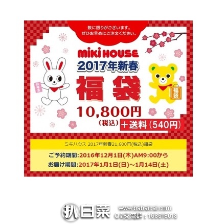 乐天国际现特价11340日元,今使用支付宝支付还可95折,实付10773日元,约¥640。现在下单预计2017年1月1日开始配送。日本Mikihouse平时买比较贵的,这次福袋价格不错,需要的速度下手。目前乐天还有可同一店铺内凑单满13900日元减1390日元活动,需用码4OKB-XE0Q-QSVP-CLOU,如果福袋能叠加满减,折后更划算!乐天国际购买地址>> | 乐天国际满13900-1390日元活动介绍(即将结束)