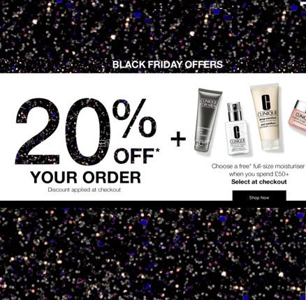 Clinique倩碧英国官网黑五全场无门槛8折促销,满50镑自选正装,不需用码,加入购物车自动优惠,赠品需在购物车页面手动添加;英国境内免邮;活动截止至北京时间12月3号早上8点左右;Clinique倩碧英国官网活动地址>>