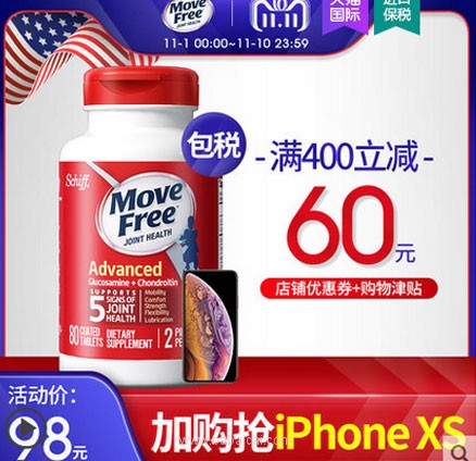 天猫Movefree官方海外旗舰店 双十一预告售价¥98,可领取店铺¥40优惠券(券单领),券后实付¥58包邮包税,历史低价,同款美国亚马逊售价$19.95,红瓶是标准版,适合日常保健用,孝敬老人不错,用量: 每日1次,每次2粒,随餐服用。天猫商城购买地址>>