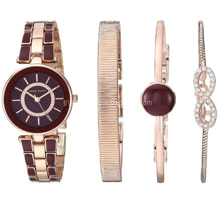 Anne Klein 家最出名的手表手链组合就是最好的诠释。不同颜色的表链搭配白不同颜色表盘,简单设计精致品味,套装包含一块手表,三条手镯/手链,施华洛世奇水晶镶嵌手镯和表链,完美搭配,时尚高颜值,表镜矿物晶体材质,石英机芯。